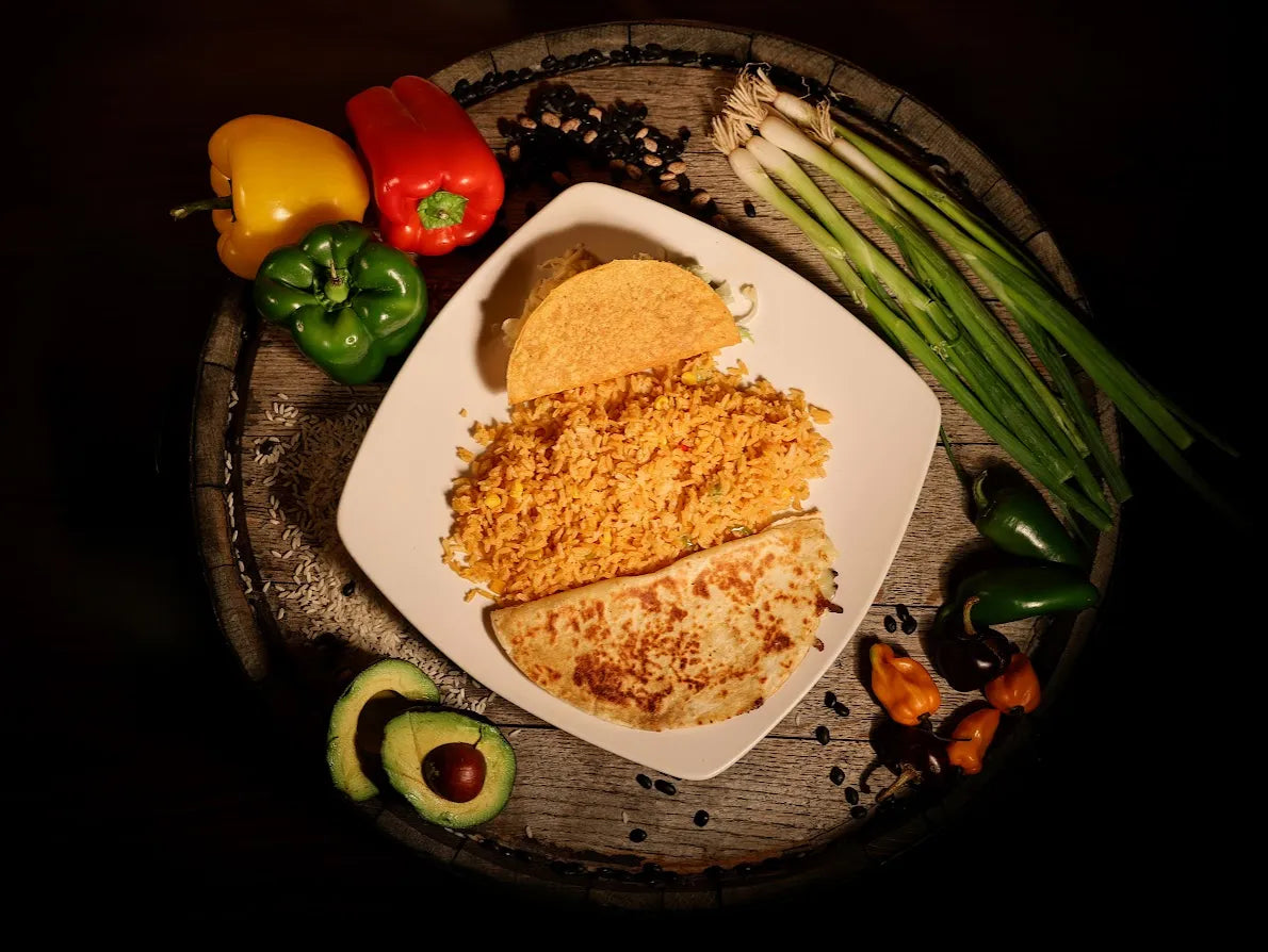Quesadilla and taco with a side of rice.