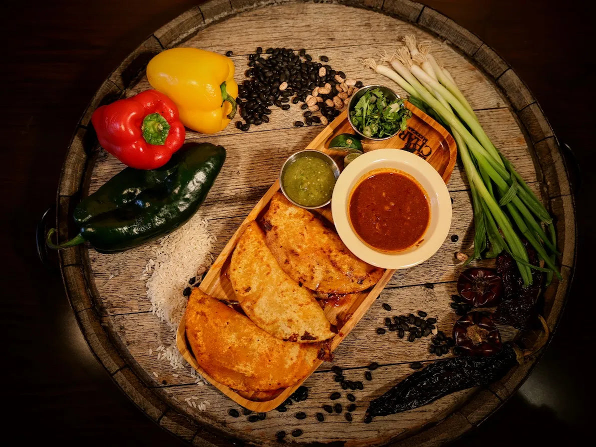 Handmade corn tortillas filled with birria and melted Chihuahua cheese. Served with side of consome soup, rice, beans, cilantro, onion, and lime.