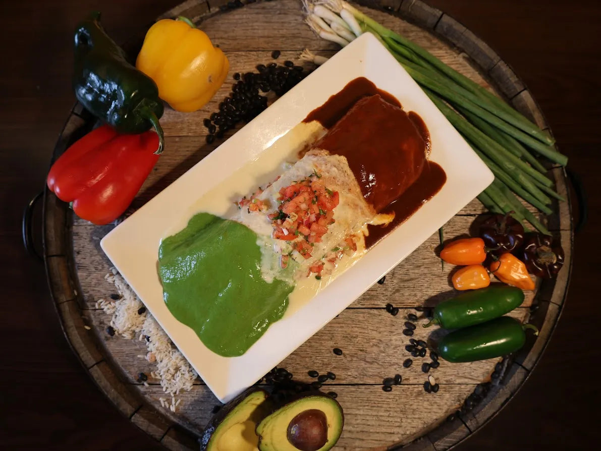 12” flour tortilla stuffed with ground beef, rice, and beans. Topped with creamy verde sauce, red sauce, cheese sauce, and pico de gallo.
