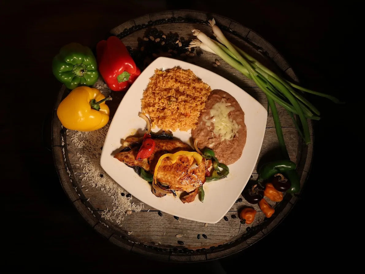 Marinated chicken breast grilled with onions, bell pepper served with rice, beans, and tortillas.